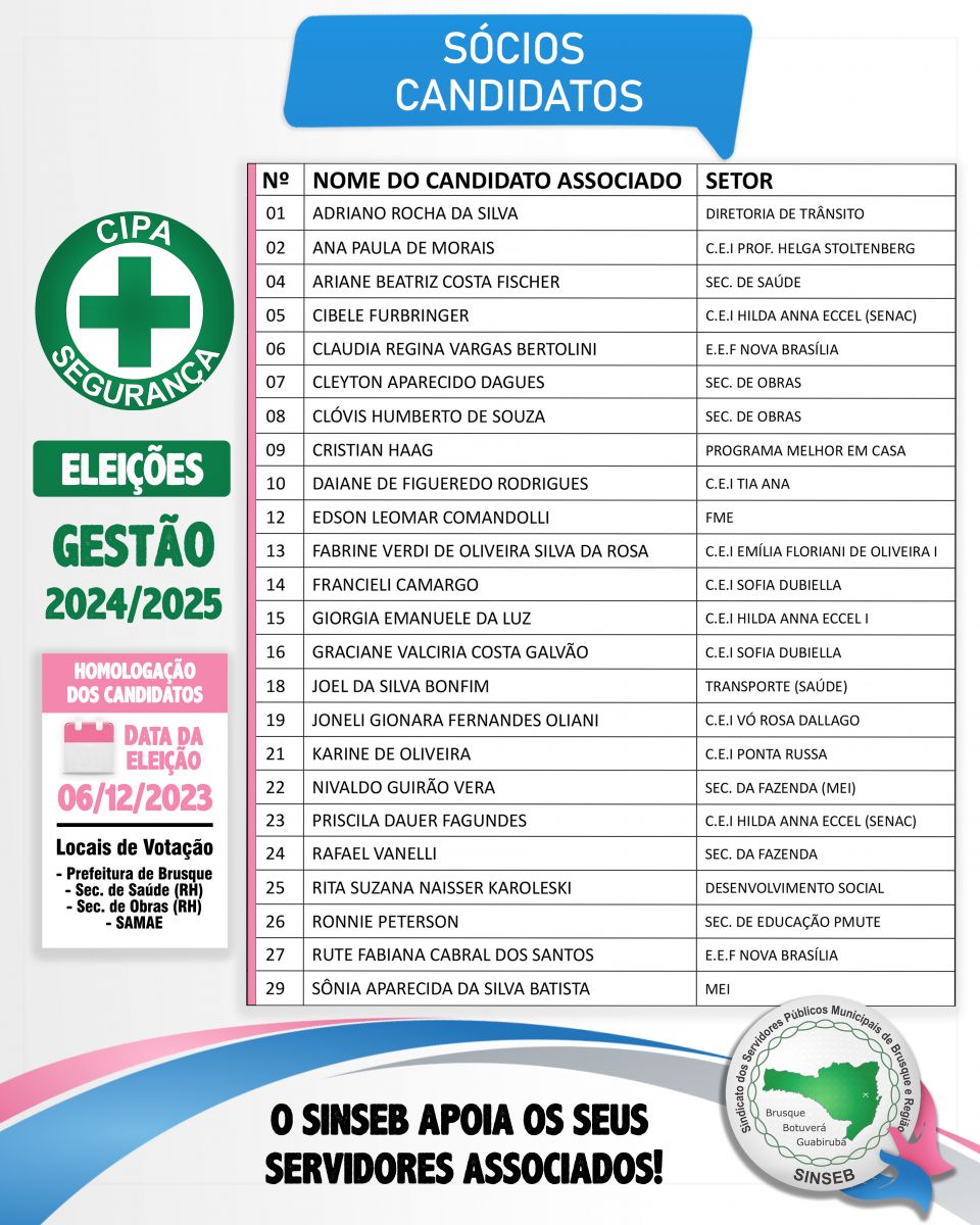 Conheça TODOS os sócios do SINSEB candidatados para as eleições da CIPA dos dias 05 e 06/12: