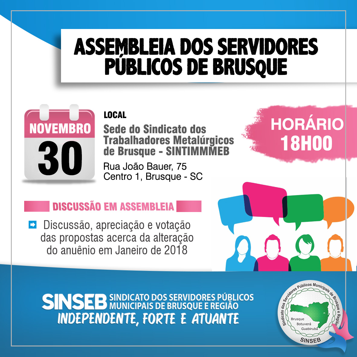 O SINSEB convoca por meio deste edital todos os servidores Municipais de Brusque do quadro provimento EFETIVO, para se reunirem em Assembleia Geral Extraordinária, nas dependências do SINTIMMEB, Rua João Bauer, 75 – Centro 1, Brusque – SC, a fim de deliberarem sobre a seguinte ordem do dia: