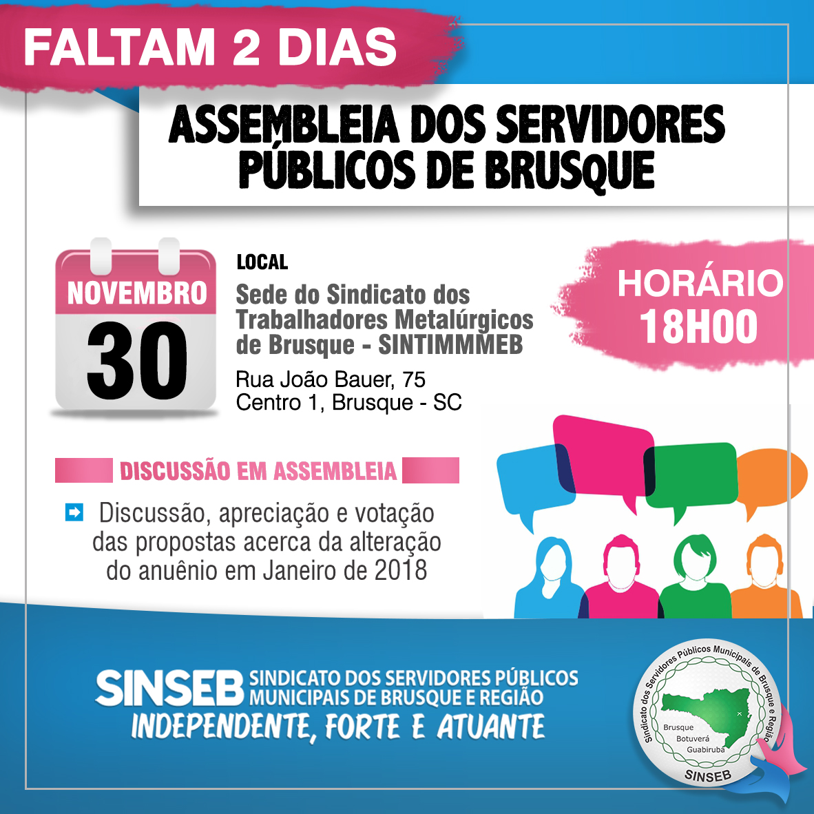 O SINSEB convoca todos os servidores Municipais de Brusque do quadro provimento EFETIVO, para se reunirem em Assembleia Geral Extraordinária, nas dependências do SINTIMMEB, Rua João Bauer, 75 – Centro 1, Brusque – SC, às 18h00 do dia 30 de Novembro, a fim de deliberarem sobre a seguinte ordem do dia: