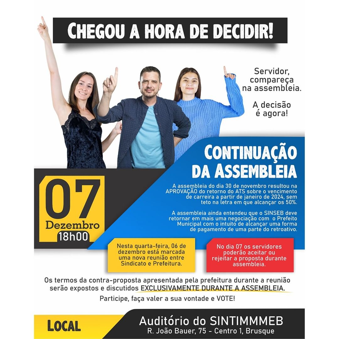 Na última assembleia os servidores aprovaram o retorno do Adicional do Tempo de Serviço sobre os vencimentos de carreira, que deve iniciar o pagamento em janeiro de 2024. Contudo, a categoria decidiu que o SINSEB deveria voltar à mesa de negociação com o Prefeito Municipal, com o intuito de tentar uma forma de pagamento de pelo menos parte dos valores retroativos.
