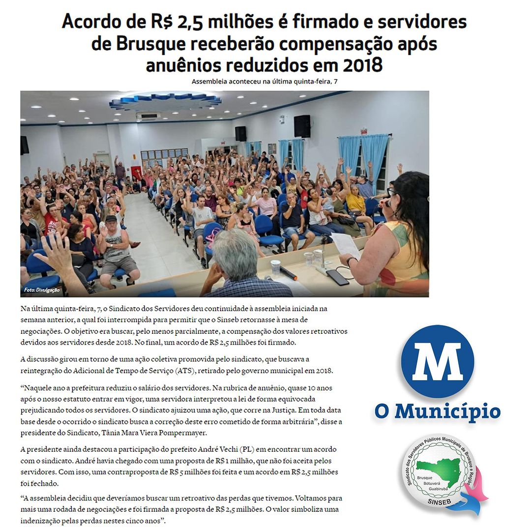 A matéria destaca os resultados na última Assembleia e o acordo que vai beneficiar os servidores de Brusque com R$ 2,5 milhões de reais