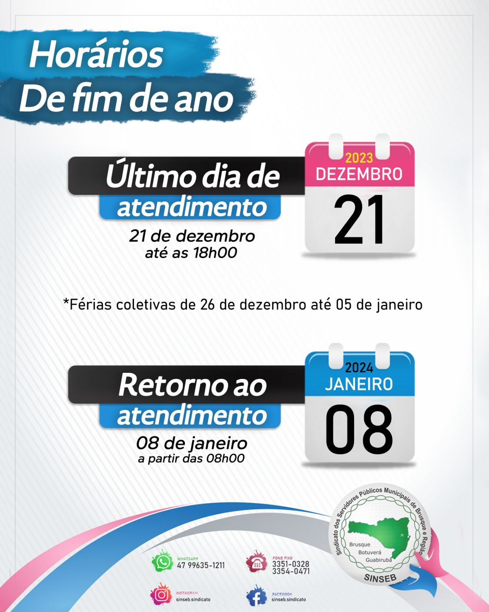 Confira a programação dos atendimentos do Sindicato durante o período de férias coletivas e retorno às atividades em horário normal.