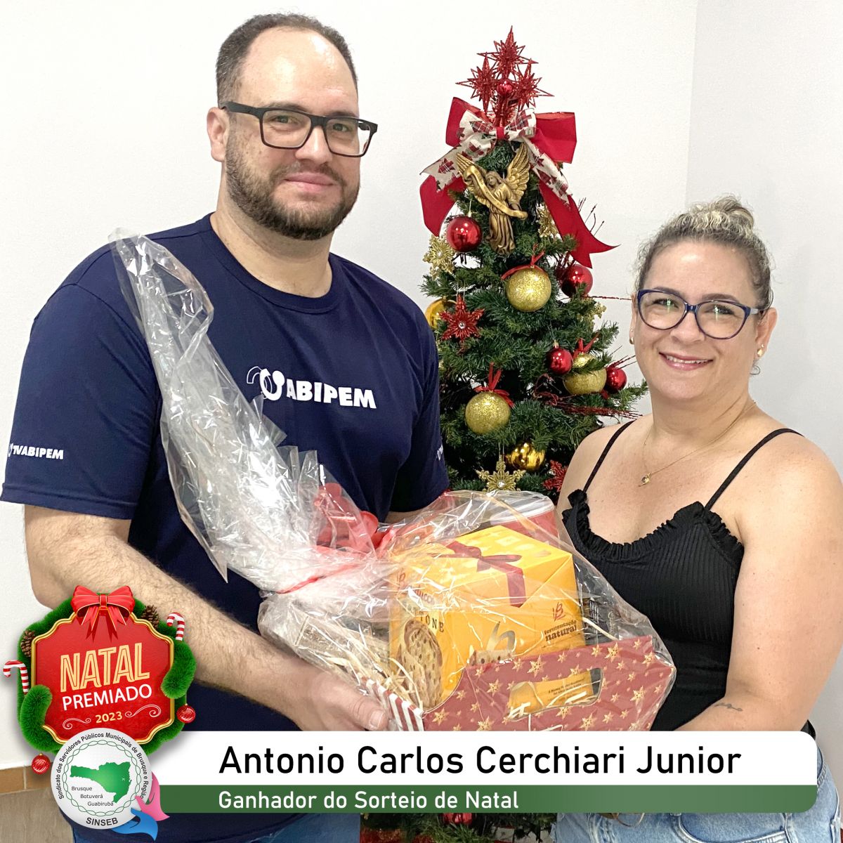 O sócio sorteado na premiação de Natal do SINSEB, Antonio Carlos Cerchiari Junior, recebendo sua cesta de Natal.