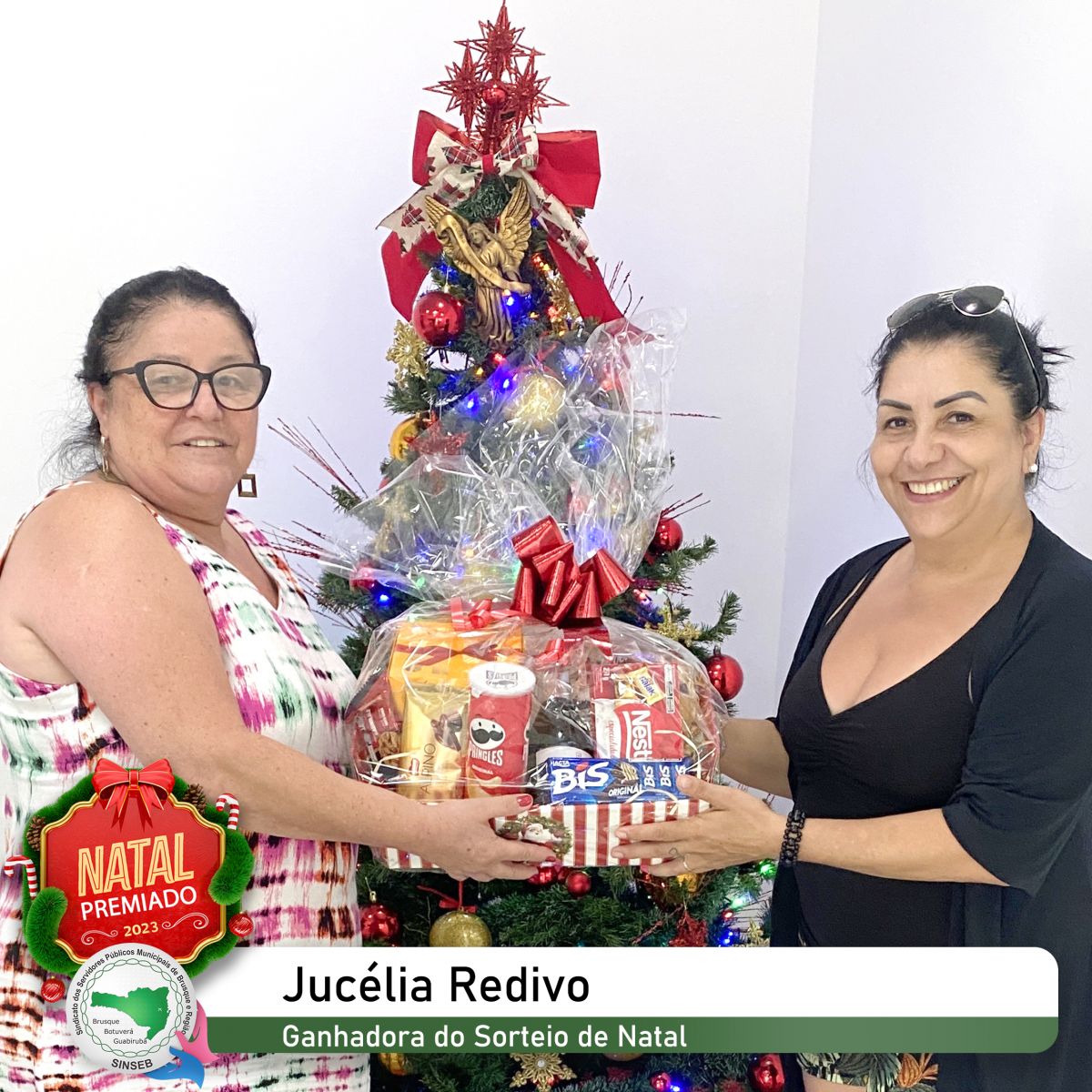 A sócia sorteada na premiação de Natal do SINSEB, Jucélia Redivo, recebendo sua cesta de Natal.