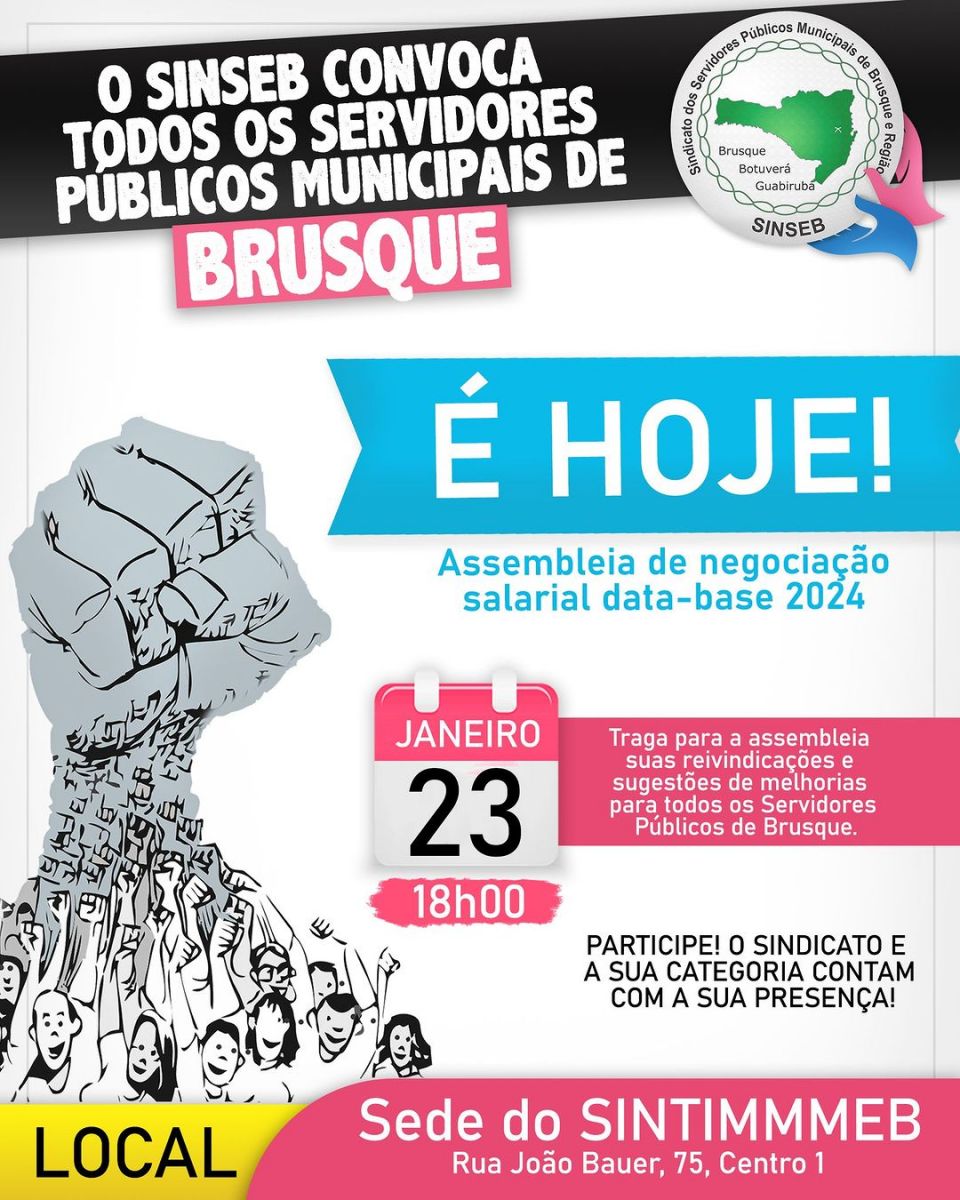 A Assembleia Geral Ordinária de Data-base de Brusque 2024 ocorrerá nesta terça-feira, dia 23 de janeiro, às 18h00 na sede do SINTIMMMEB.