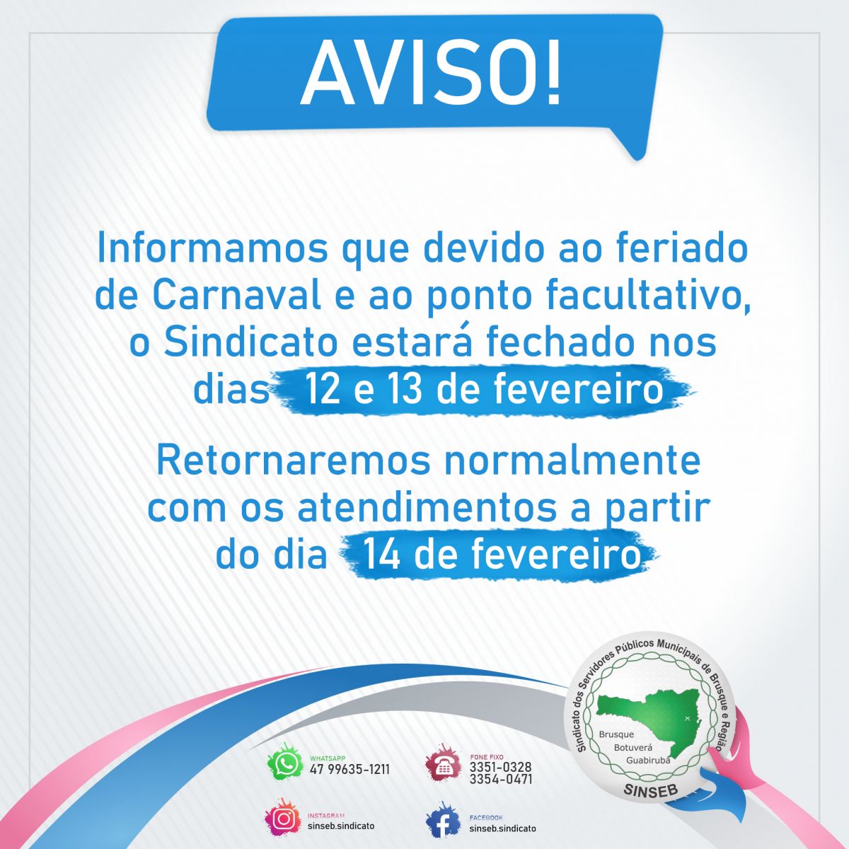 Aviso! Informamos que devido ao feriado de Carnaval e ao ponto facultativo, o Sindicato estará fechado nos dias 12 e 13 de fevereiro. Retornaremos normalmente com os atendimentos a partir do dia 14 de fevereiro.