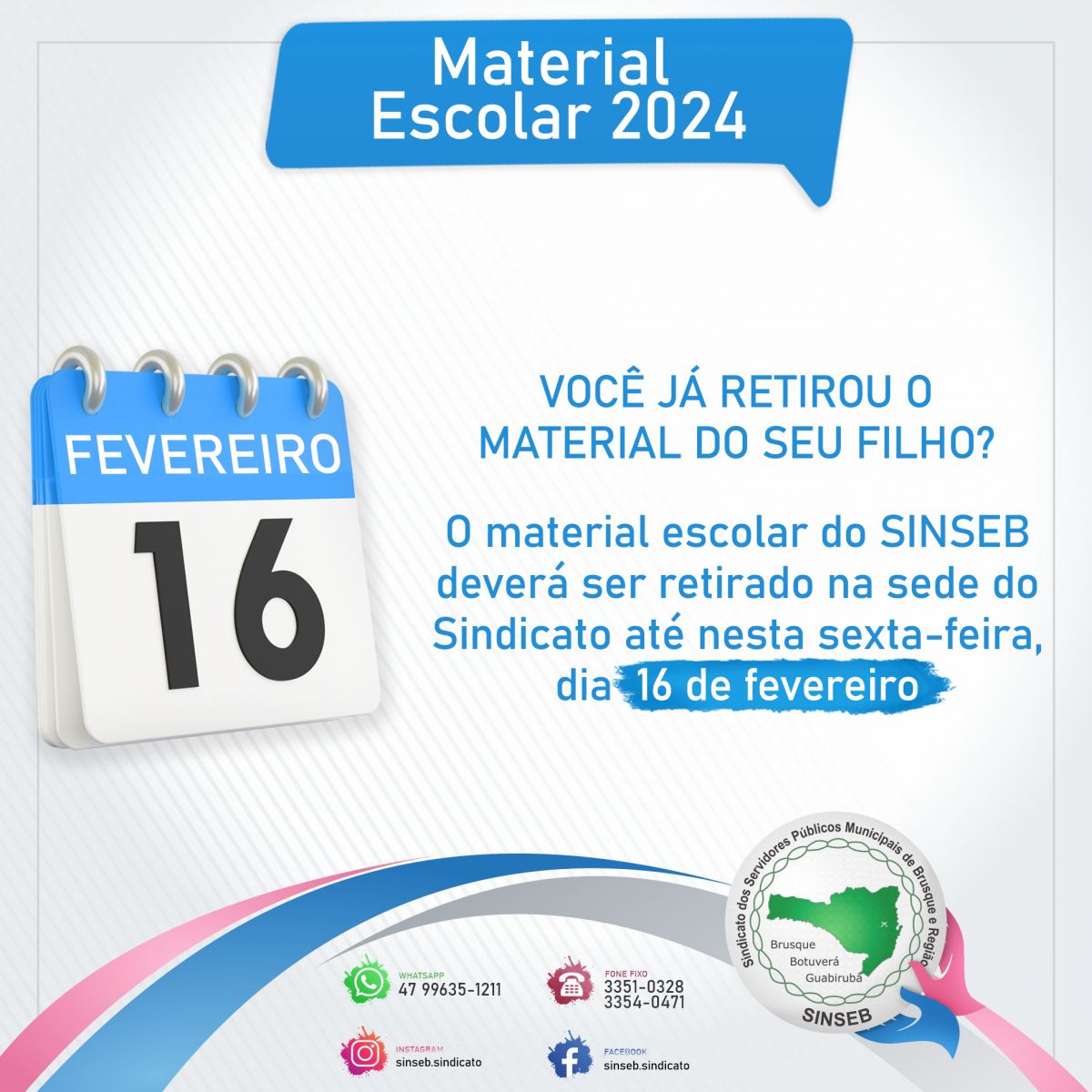 O material escolar do SINSEB deverá ser retirado na sede do Sindicato até nesta sexta-feira, dia 16 de fevereiro