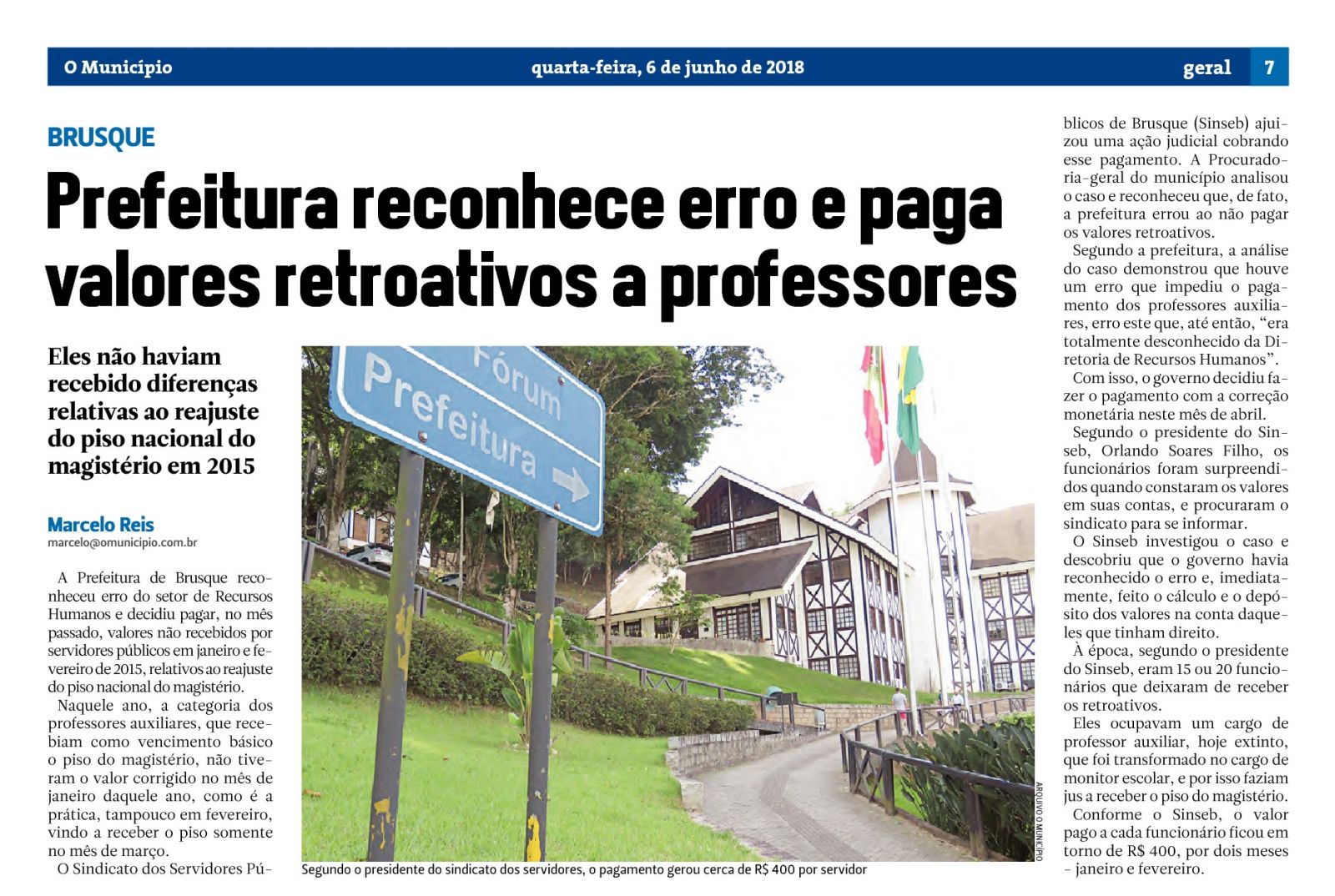 "O Sindicato dos Servidores Públicos de Brusque (Sinseb) ajuizou uma ação judicial cobrando esse pagamento. A Procuradoria-Geral do município analisou o caso e reconheceu que, de fato, a prefeitura errou ao não pagar os valores retroativos."