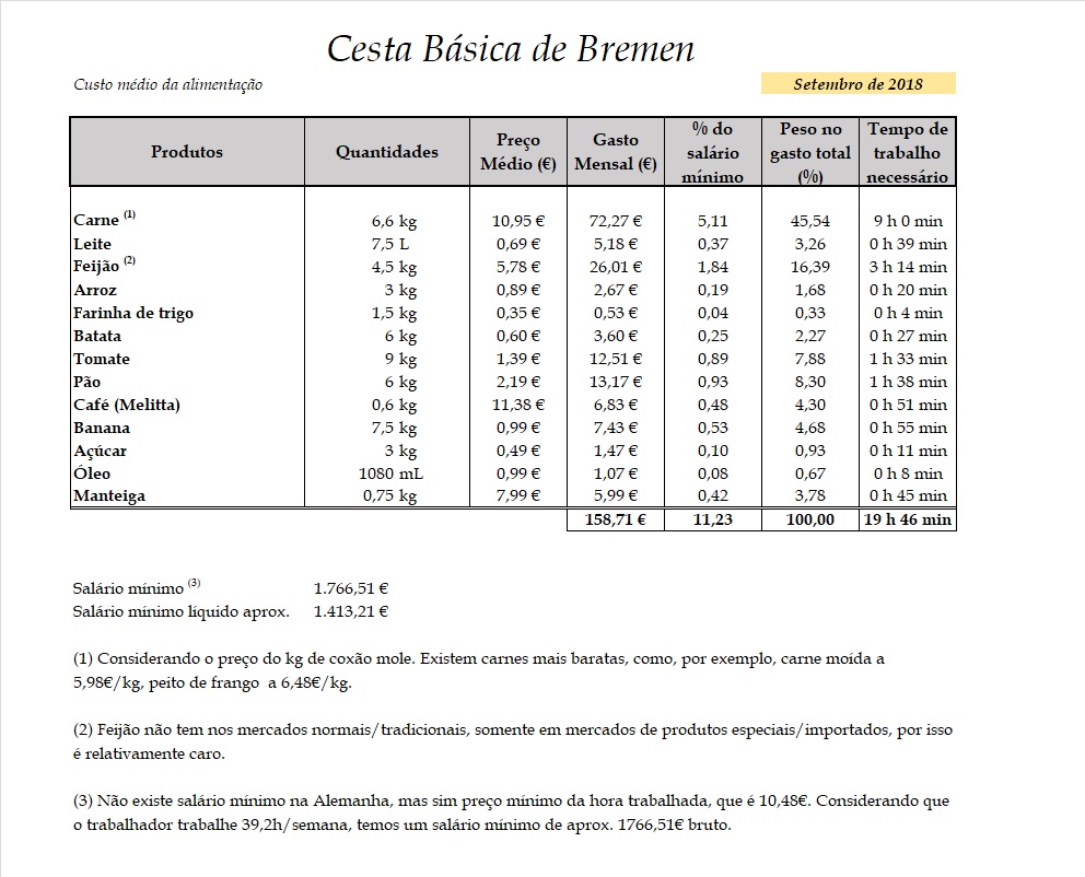 Também é importante destacar, que toda esta Cesta Básica consome apenas 11,23% do salário mínimo em Bremen, já em Brusque, este percentual sobe para 42,6%.