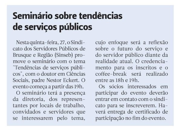 A matéria do Jornal publicada nesta terça-feira (25/09), fala sobre o seminário promovido pelo Sinseb, cujo tema é "Tendências de Serviço Público", que acontecerá nesta quinta-feira no auditório do Sindicato dos Metalúrgicos - SINTIMMMEB, na Rua João Bauer, nº 75, Centro de Brusque.
