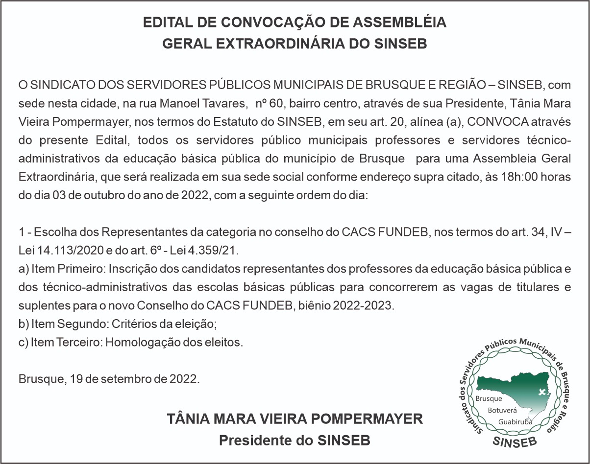 O Sindicato, através da Presidente Tânia Mara Vieira Pompermayer, convoca todos os servidores públicos da educação para Assembleia Geral Extraordinária, com pauta na eleição dos representantes do FUNDEB, que será realizada em nossa sede, às 18h do dia 03 de Outubro, primeira segunda-feira do mês.