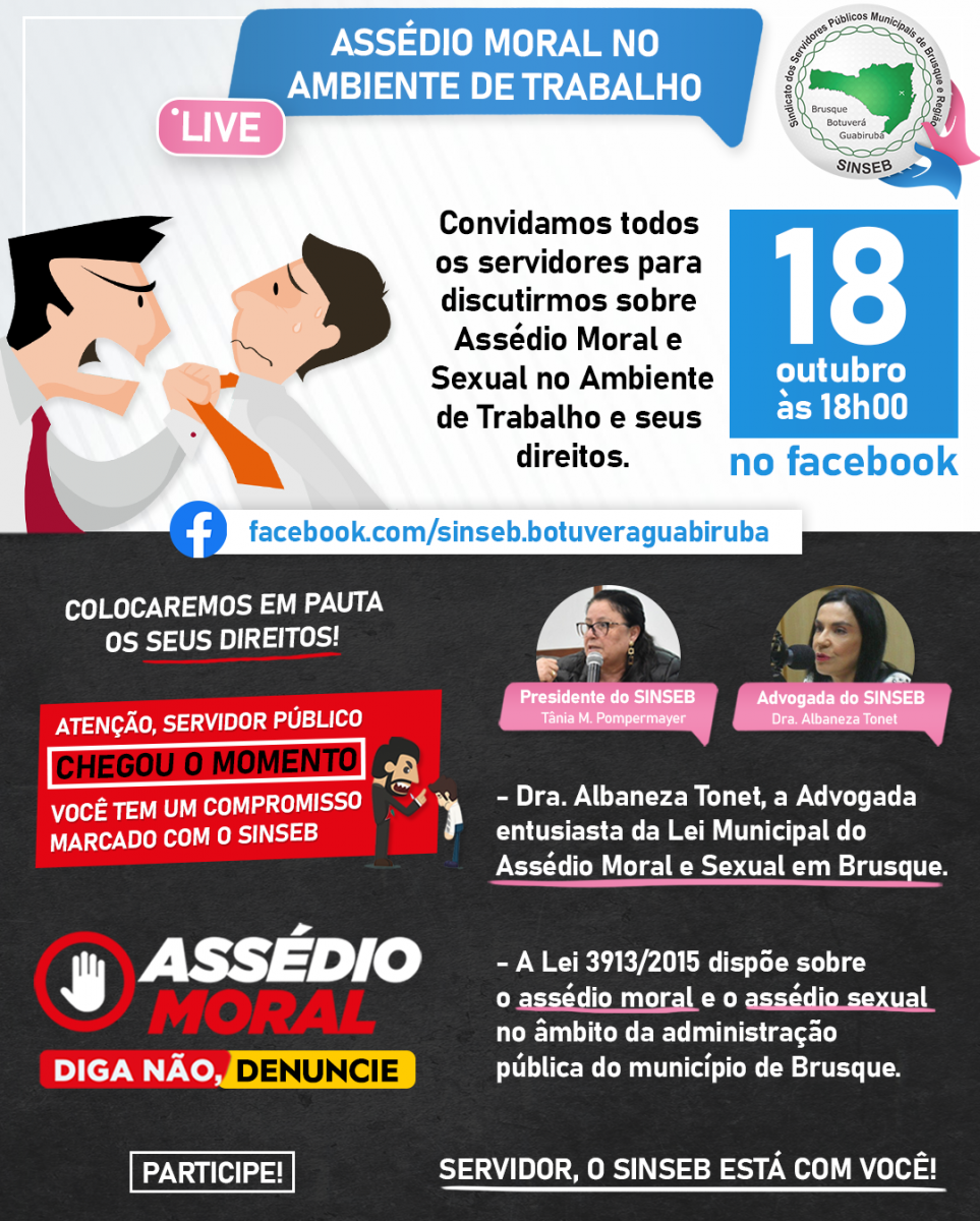 O SINSEB convida à todos para participarem da nossa live sobre "Assédio Moral no Ambiente de Trabalho", na próxima terça-feira (18/10), a partir das 18h00 no Facebook do Sindicato.