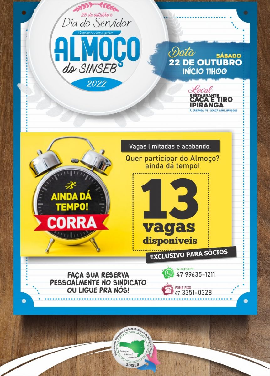 As vagas para o Almoço do Dia do Servidor Público estão acabando! Restam apenas 13 vagas! Faça sua reserva pessoalmente no sindicato ou ligue para nós através dos contatos: 47 99635-1211 e 47 3351-0328