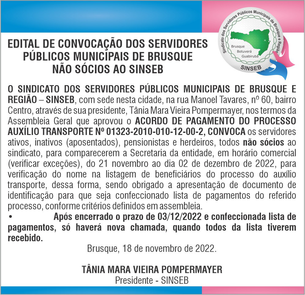 Edital de convocação dos Servidores Públicos Municipais de Brusque não-sócios ao SINSEB