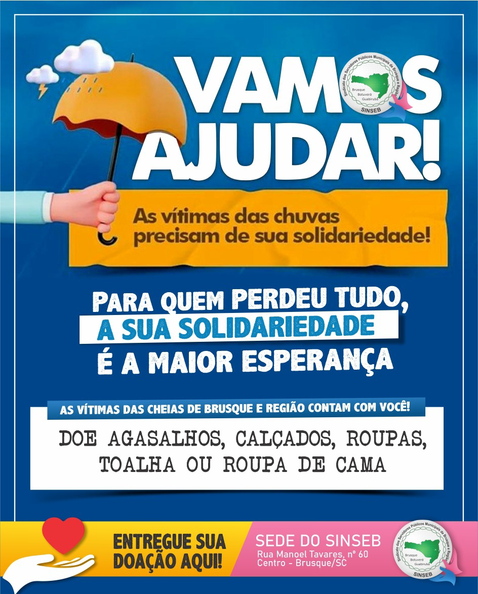 Entregue suas doações na sede do SINSEB, R. Manoel Taváres, nº 60, Centro – Brusque. Estaremos aguardando você nessa causa!