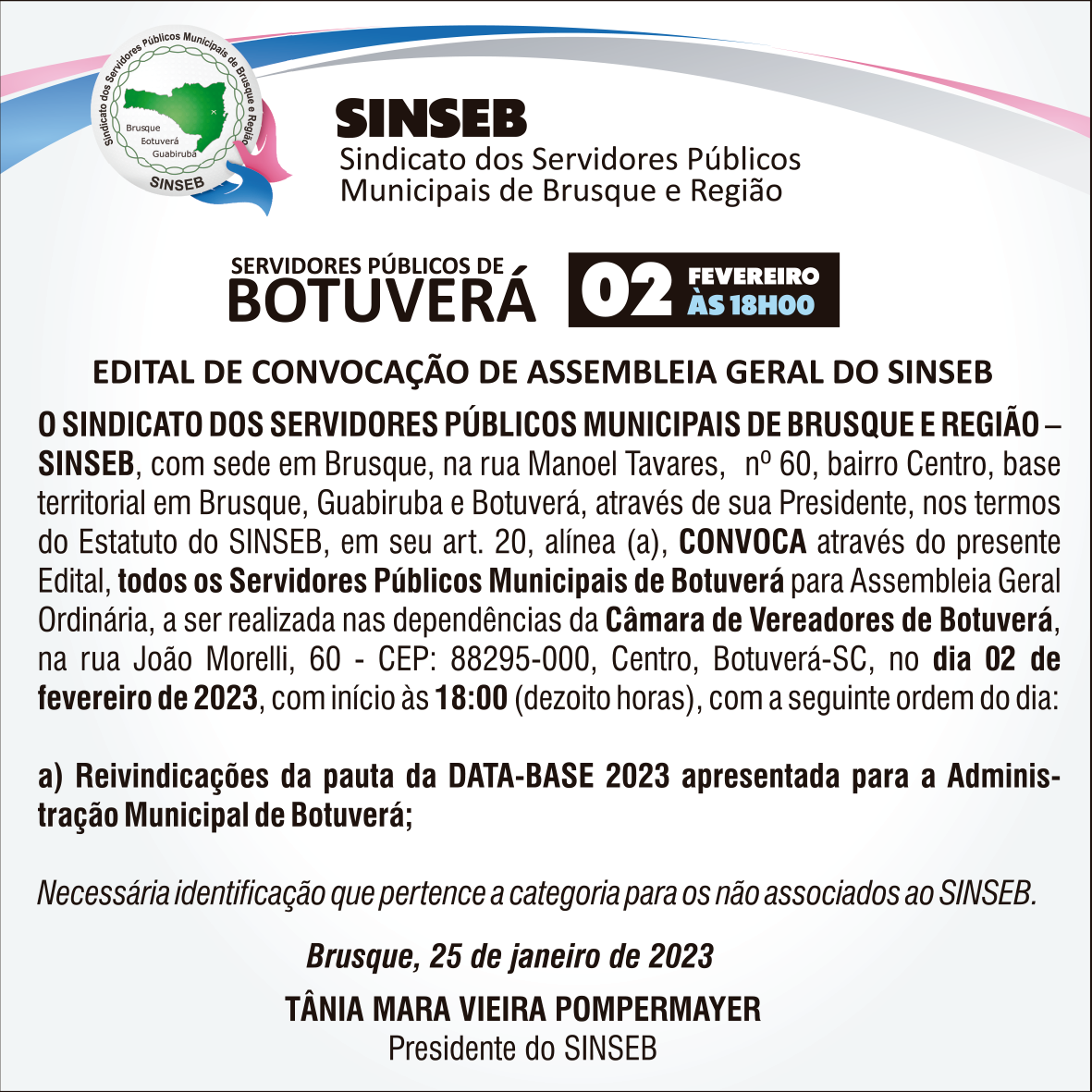 O Sindicato, através da Presidente Tânia Mara Vieira Pompermayer, convoca todos os servidores públicos municipais de Botuverá, para comparecerem na Assembleia Geral Ordinária, dia 03 de Fevereiro, com início às 18h00, nas dependências da Câmara de Vereadores de Botuverá, Rua João Morelli, 60 - CEP: 88295-000, Centro, Botuverá-SC, com a seguinte ordem do dia: