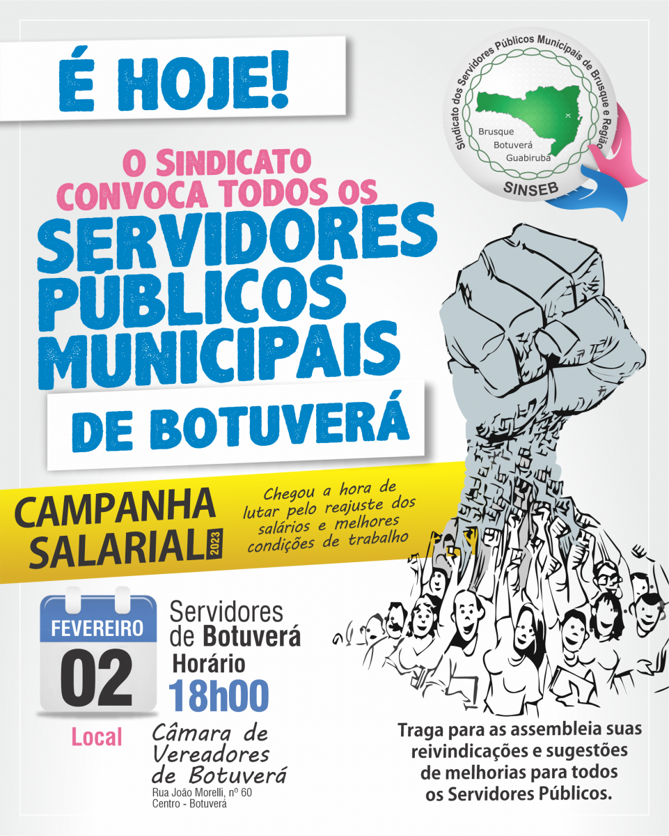 O SINSEB faz a última chamada à você servidor público de Botuverá para comparecer na Assembleia Geral Ordinária, às 18h00 de hoje, nas dependências da Câmara de Vereadores de Botuverá, Rua João Morelli, 60, Centro - Botuverá.