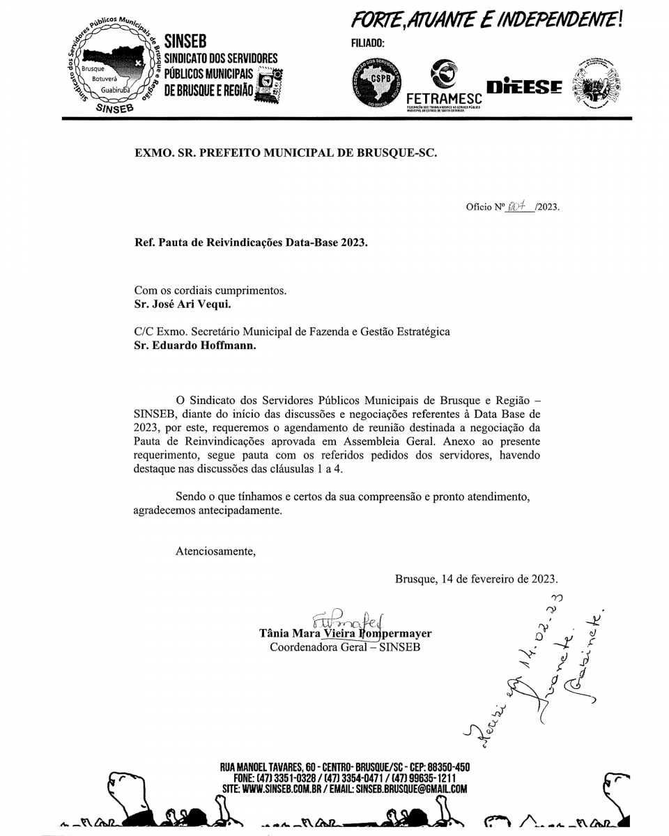 SINSEB inicia negociação em Brusque, Guabiruba e Botuverá