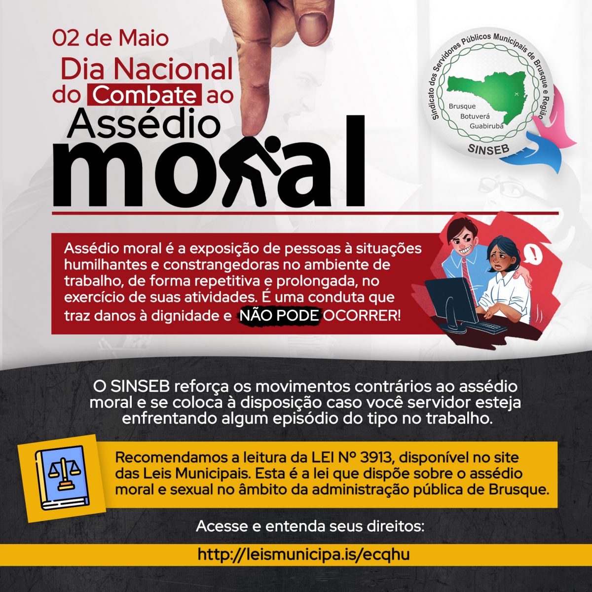 No dia 02 de Maio se comemora o Dia Nacional do Combate ao Assédio Moral e o SINSEB reforça os movimentos contrários ao assédio moral e se coloca à disposição caso você servidor esteja enfrentando algum episódio do tipo o trabalho.