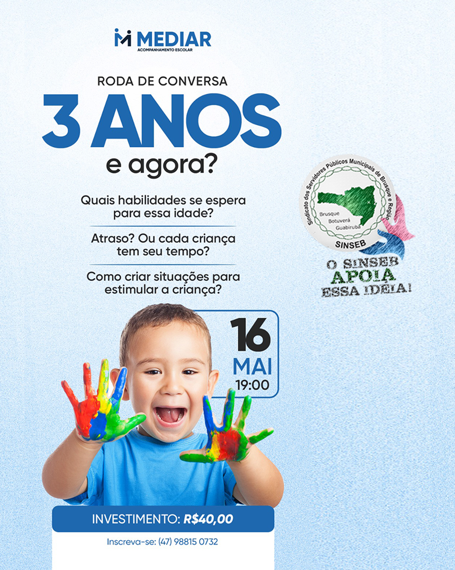 Conveniada do SINSEB, a clínica MEDIAR promove uma roda de conversa a respeito das dificuldades e dúvidas em relação a chegada dos 3 aninhos na vida da criança e de seus responsáveis.