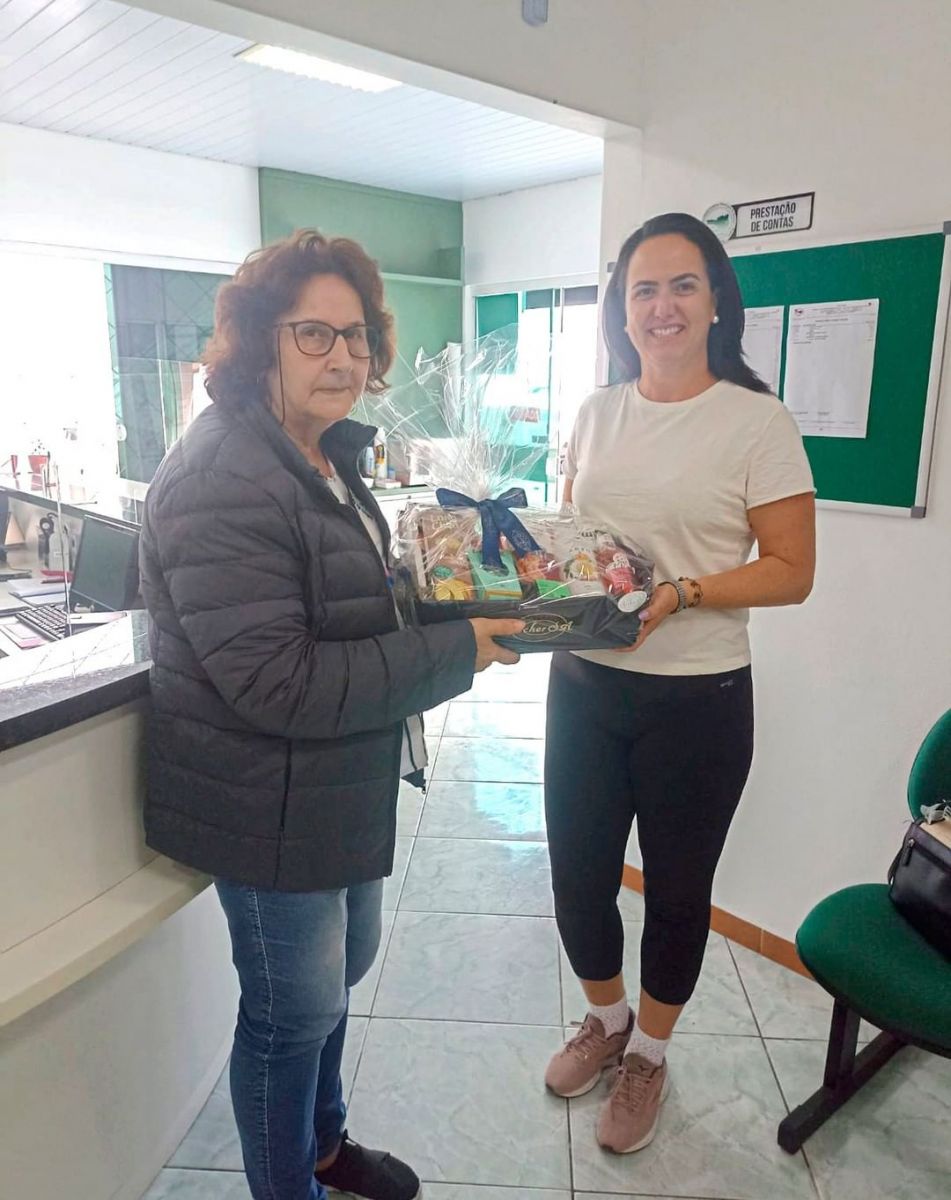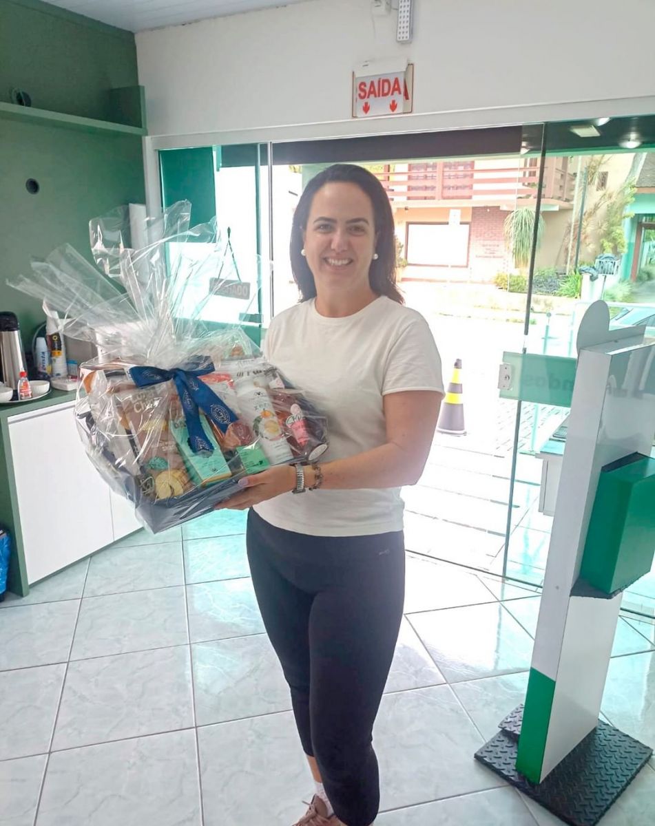 Mais uma ganhadora da promoção de Dia das Mães retirou sua cesta. Ana Carina Salvin é sócia do sindicato e recebeu a cesta de café da manhã das mãos da diretora sindical Marli A. Nascimento.