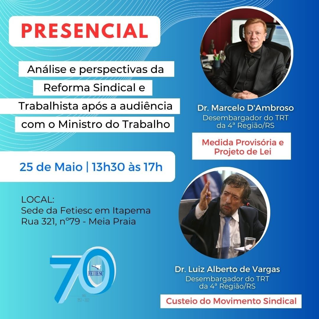 Na tarde de quinta-feira, 25 de Maio, o SINSEB esteve presente na Federação dos Trabalhadores nas Indústrias de Santa Catarina (FETIESC), através da presidente Tânia Mara Vieira Pompermayer e assessorias do Sindicato, para participação em dois eventos que reuniram dezenas de lideranças sindicais do estado.