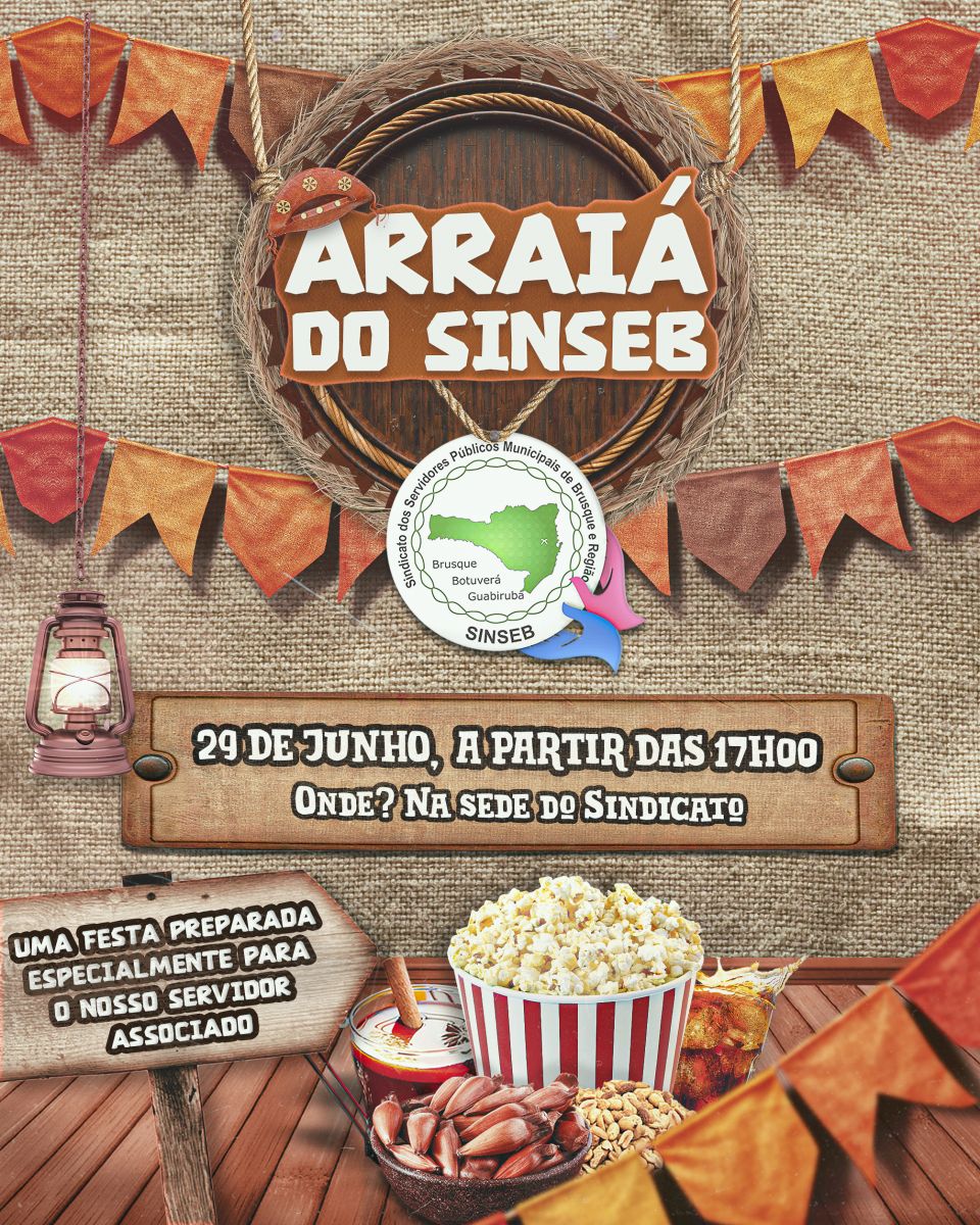 Venha se divertir conosco no Arraiá do SINSEB, uma festa junina exclusiva para nossos servidores associados, celebrando o melhor da cultura do nosso país, na sede do SINSEB, a partir das 17h00 do dia 29/06.