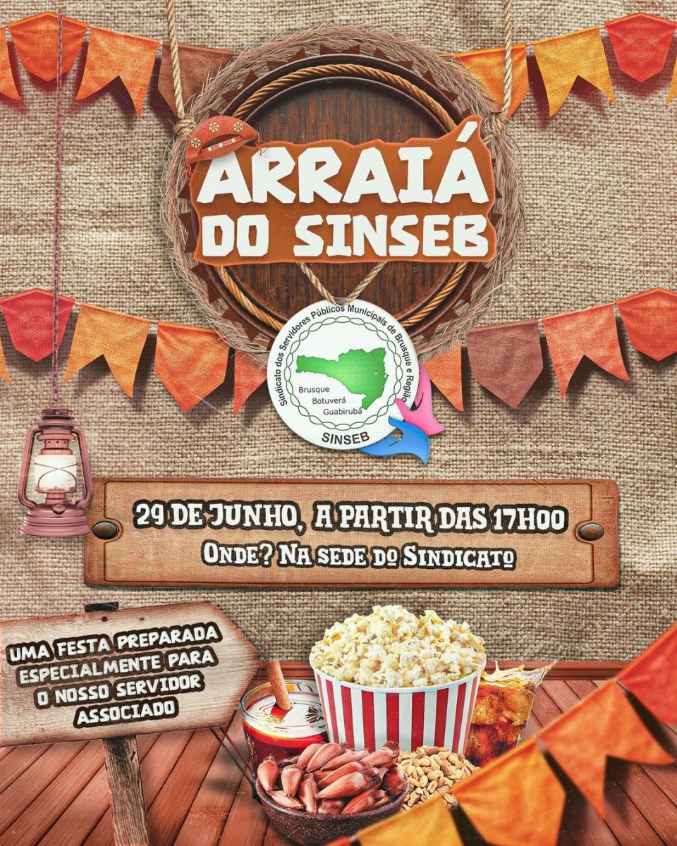 Junte-se a nós no Arraiá do SINSEB, uma festa junina especial para nossos servidores associados, onde celebraremos o melhor da cultura do nosso país. O evento será realizado na sede do SINSEB, a partir das 17h00 do dia 29/06.