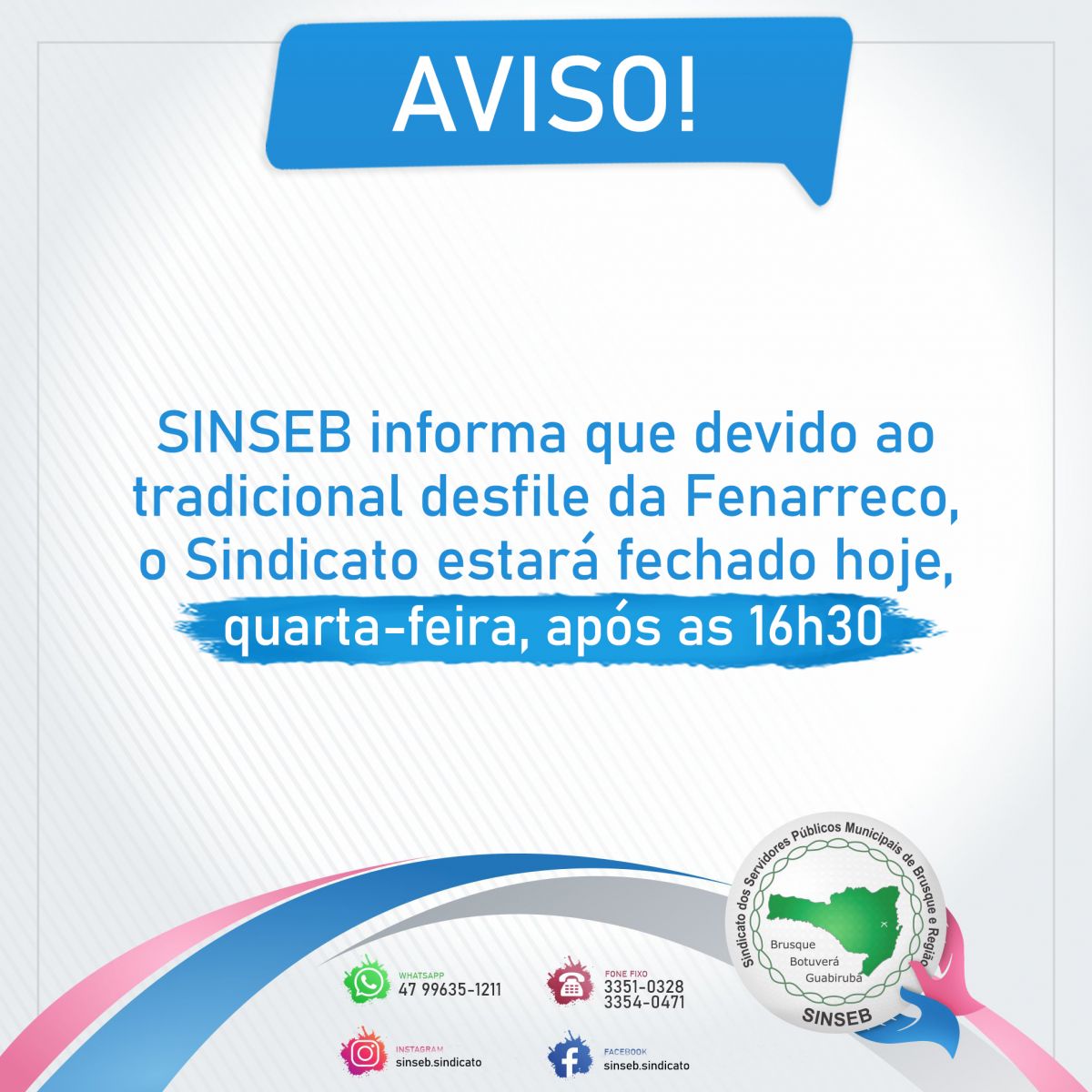 Aviso - SINSEB informa que devido ao tradicional desfile da Fenarreco, o Sindicato estará fechado hoje, quarta-feira, após as 16h30.