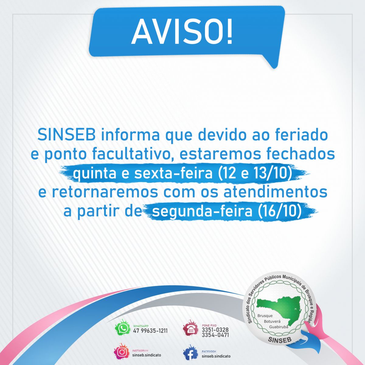 Aviso - SINSEB informa que devido ao feriado e ponto facultativo, estaremos fechados quinta e sexta-feira (12 e 13/10)