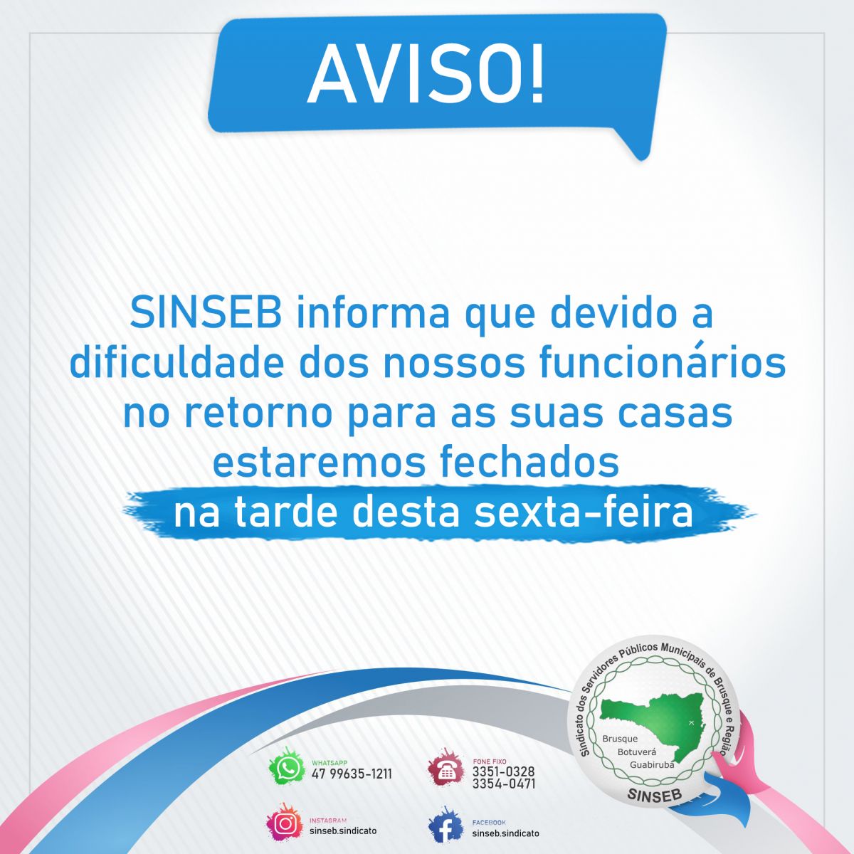 Aviso - SINSEB fechado na tarde desta sexta-feira devido a dificuldade dos nossos funcionários no retorno para as suas casas, causado pelas chuvas.