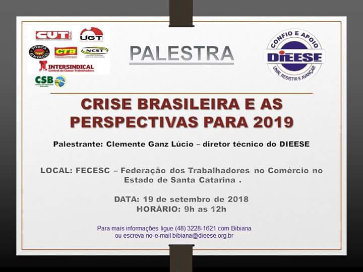 O Presidente do Sinseb, Orlando Soares Filho, está participando de uma palestra promovida pelo DIEESE - Departamento Intersindical de Estatística e Estudos Socioeconômicos, que trata sobre a "Crise brasileira e as perspectivas para 2019".