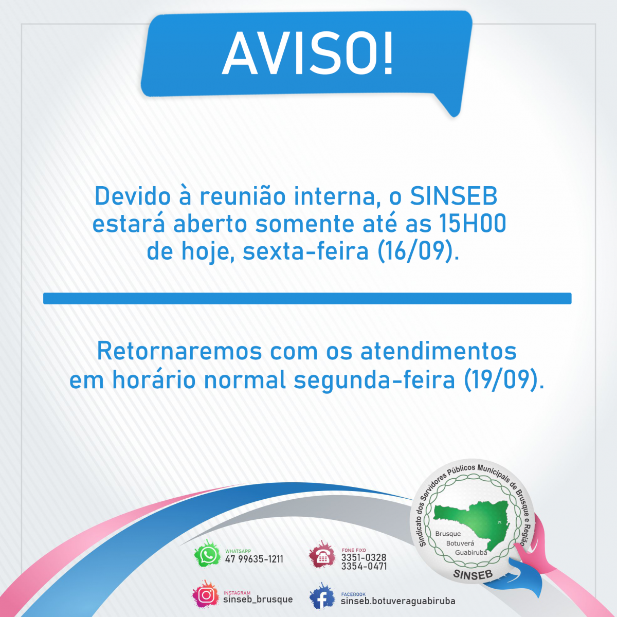 Aviso! - Encerramento mais cedo hoje (16/09) devido reunião interna.