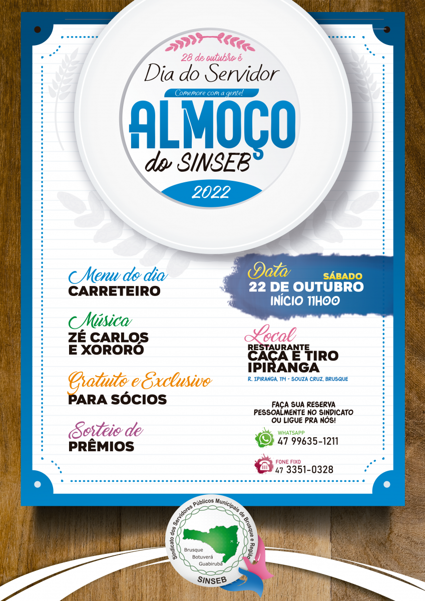 Venha prestigiar esse evento do SINSEB que homenageia o Servidor Público, no Restaurante Caça e Tiro Ipiranga, a partir das 11h00, dia 22/10. Não perca esse dia, com uma celebração preparada especialmente para os nosso Servidores.