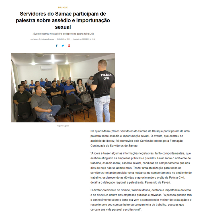 Na quarta-feira (29) os servidores do Samae de Brusque participaram de uma palestra sobre assédio e importunação sexual. O evento, que ocorreu no auditório do Ibprev, foi promovido pela Comissão Interna para Formação Continuada de Servidores do Samae.